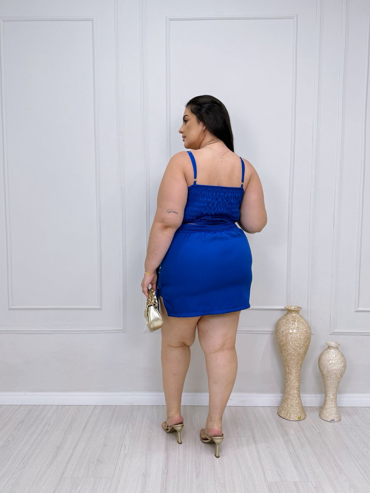 - short saia, com short por baixo;